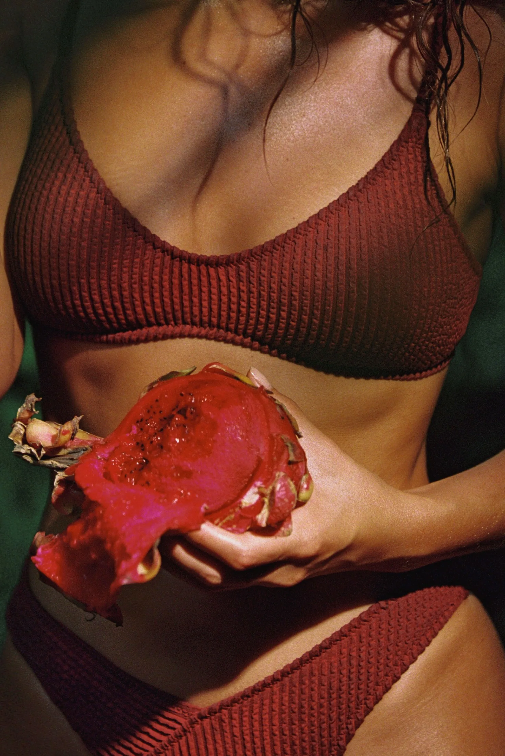 This bikini has a scooped neckline, adjustable shoulder straps and light padding. Flattering V-cut waistline at bottom.